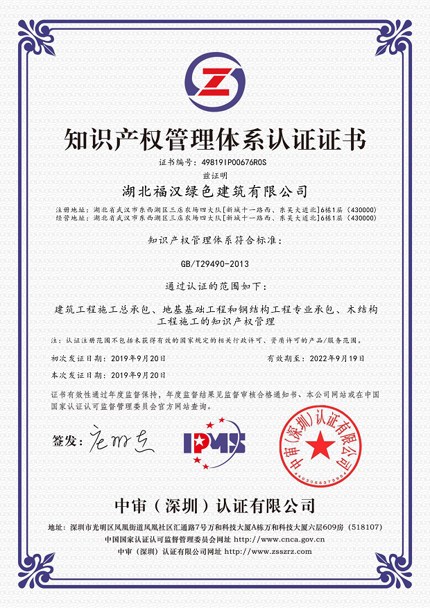 熱烈祝賀湖北福漢綠色建筑有限公司于2019年9月獲得知識產(chǎn)權(quán)貫標(biāo)認(rèn)證證書,這意味著福漢綠色在知識產(chǎn)權(quán)領(lǐng)域獲得到重要認(rèn)可,在知識產(chǎn)權(quán)方面得到進(jìn)一步規(guī)范和在綜合競爭力得到進(jìn)一步提升。